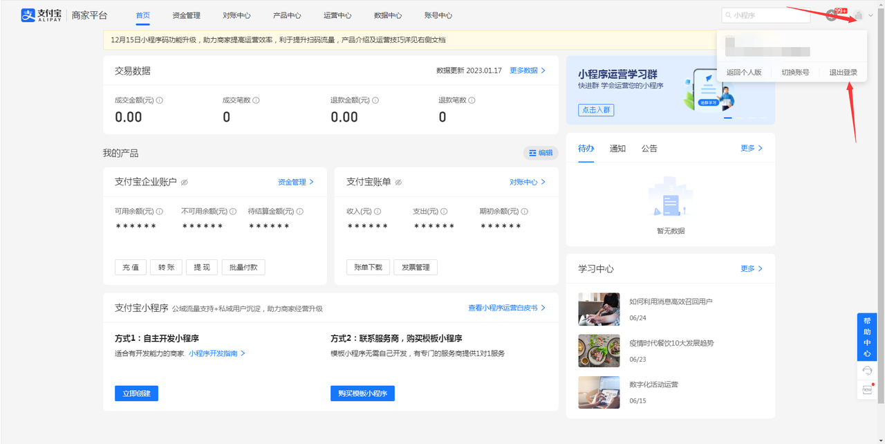 **切换至商户版以后点退出登录(一定要点退出登录)**