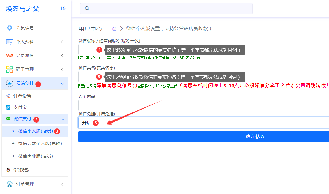 **这里必须填写收款微信的真实昵称和真实姓名(错一个字节都无法成功回调)**