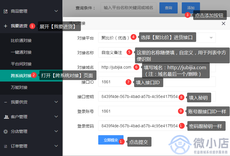 ##### 5.微小店后台,进入到跨系统对接页面。输入上方收集到的必要信息,填入并点击确定提交。