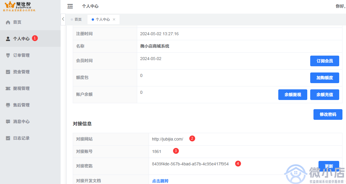 ##### 4.进入到聚比价管理界面,点击【个人中心】,复制域名、对接账号、对接秘钥到微小店后台添加。
