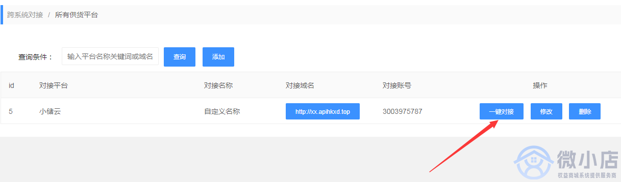 ##### 5.在列表中的右边,点击一键对接按钮,进入到对接页面。