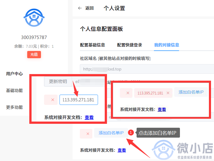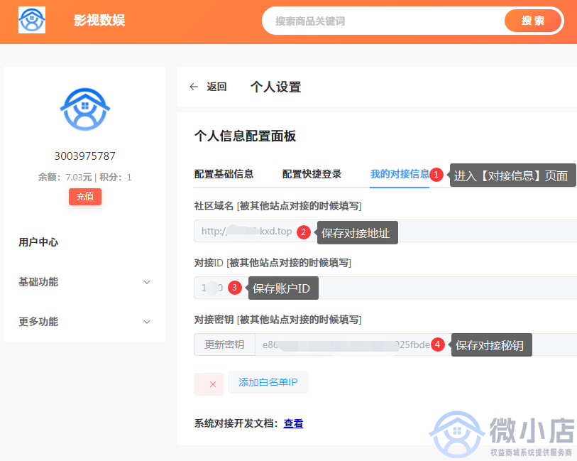 ##### 3.进入到个人信息页面后。打开【我的对接信息】窗口。并保存好对接地址、账户ID、对接秘钥。