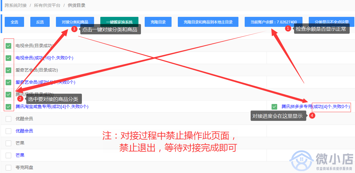 ##### 10.检查余额显示是否正常,并选中要对接的分类,点击一键对接分类和商品。
