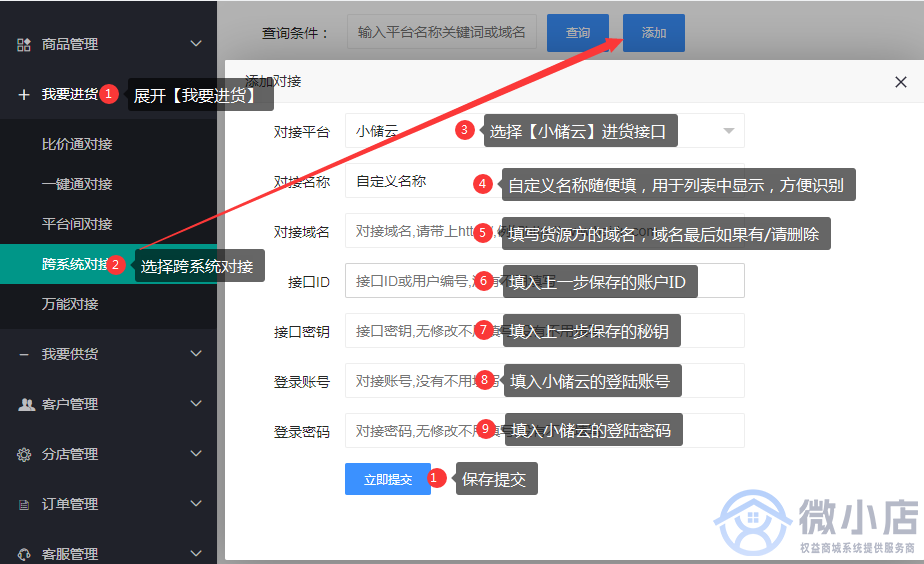 ##### 4.微小店后台,进入到跨系统对接页面。点击添加按钮,选择【小储云】进货接口,输入上方收集到的必要信息和账号密码,填入并点击确定提交。