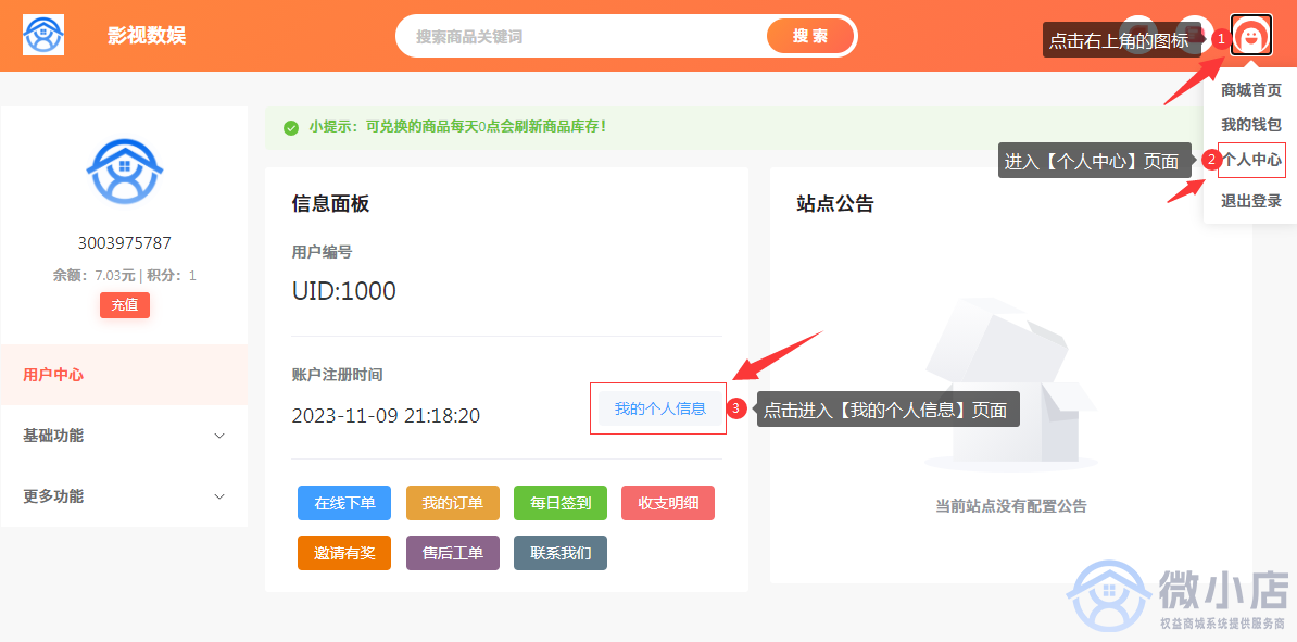 ##### 3.点击右上角的图标,进入【个人中心】页面,然后点击【我的个人信息】。