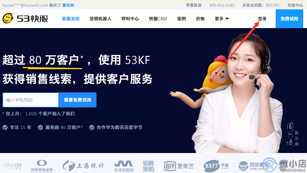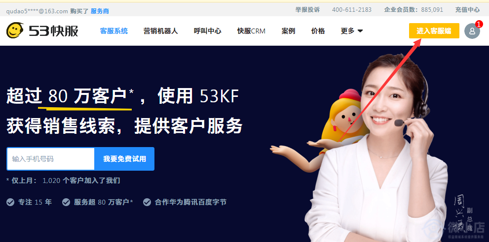 1.打开【[53客服系统](https://www.53kf.com/)】,点击右上角免费试用,并注册一个53客服的账户。
