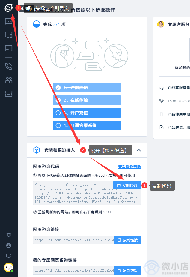 5.点击左上角的人头像图标,进入引导页面,点击中间的【安装和渠道接入】,复制客服代码。