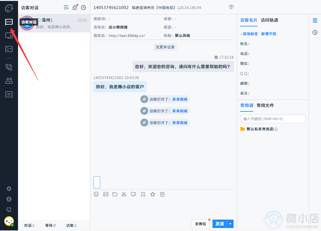 8.打开网页版客户售后端:[https://open.53kf.com/](https://open.53kf.com/),点击左边第二个【访客对话】即可在线售后聊天了。