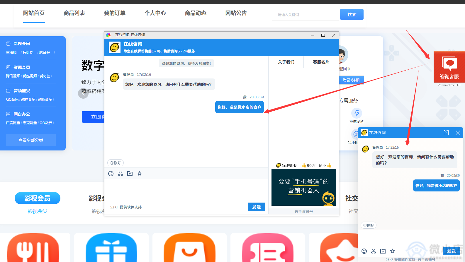 PC客户端:[点击下载](https://s0up.53kf.com/g1/M00/19/8F/wKhvt2YXP1iEW61YAAAAACuA5Hc745.exe?attname=53KF_v7.6.9.3_setup.exe)