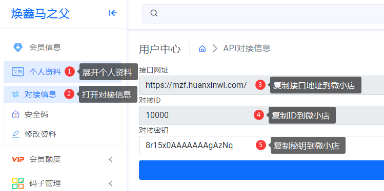 3.监控网址挂好之后,回到马支付系统。打开【对接信息】页面,找到并保存好接口地址、ID和秘钥。