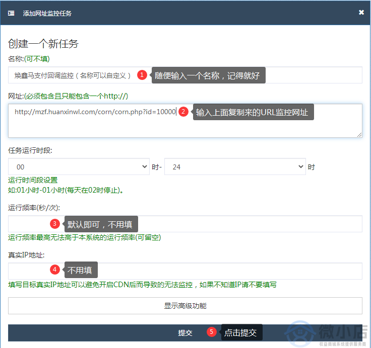 输入第二步复制来的监控网址,并补填其他信息(如下图提示操作)点击提交。