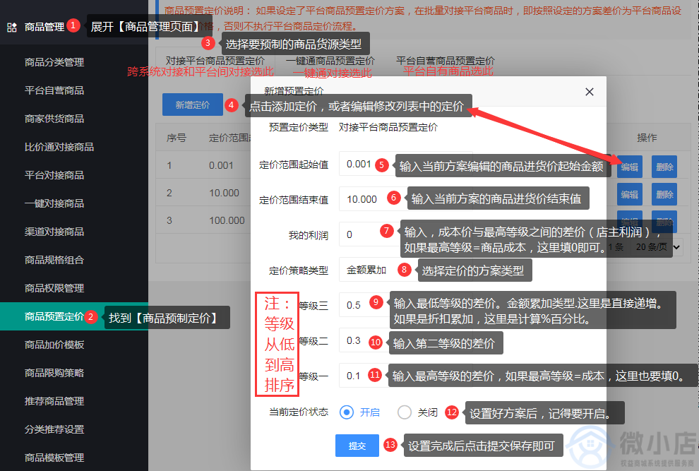 1.展开【商品管理】,并找到【商品预制定价】,点击打开。(新店这里会有默认配置了一个预制定价),先从这个开始编辑,后面还有其他方案再新增,注意整套方案的起始必须是0.001元,结尾必须是9999999.999元。其他说明如下图: