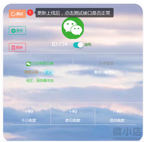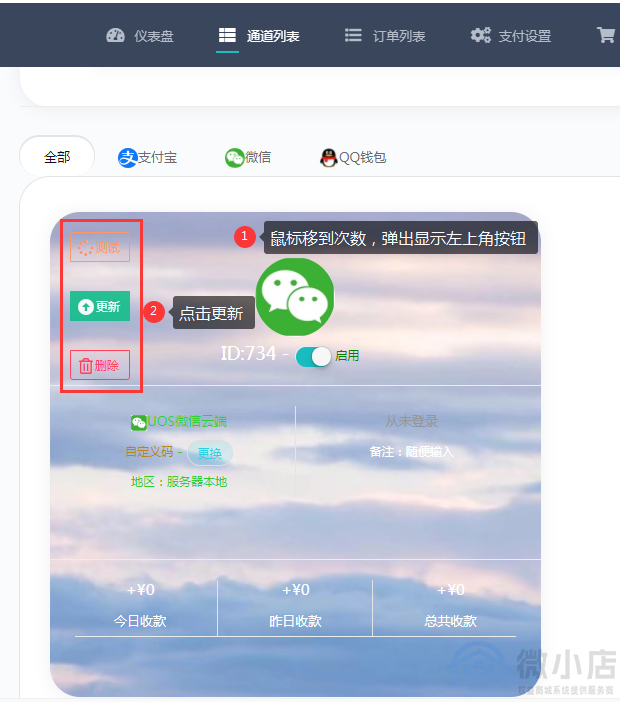##### 4.通道添加完成后,鼠标移动到以下窗口,弹出操作按钮,点击更新,并扫码登陆账户。