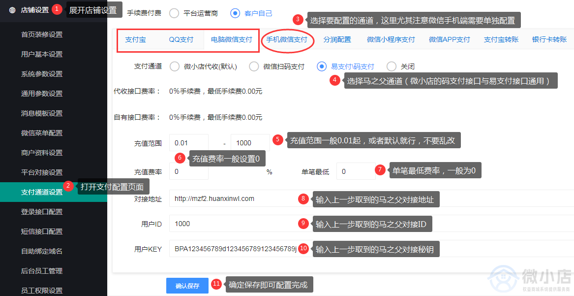 4.充值费率,就是客户需额外支付的手续费,一般设置0。
