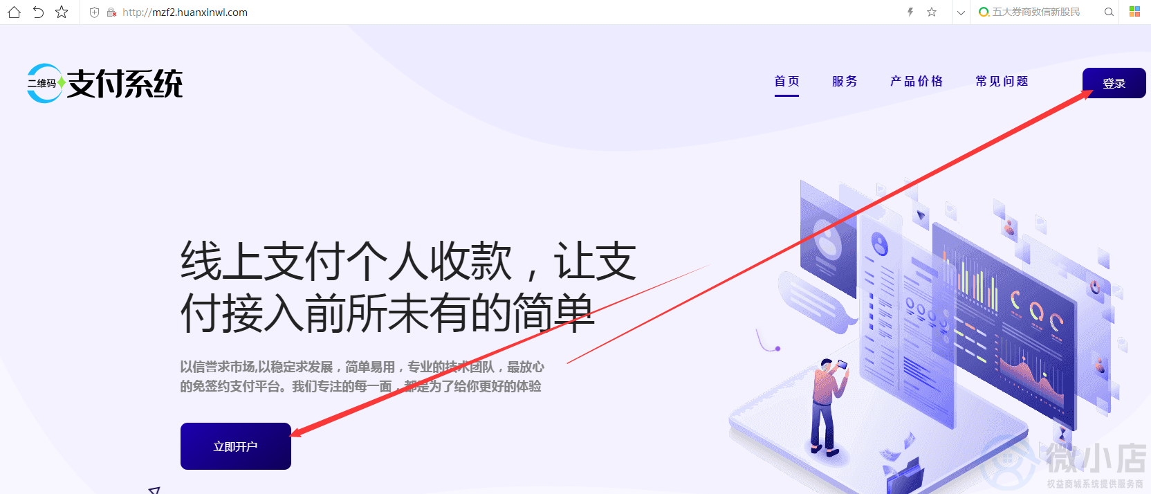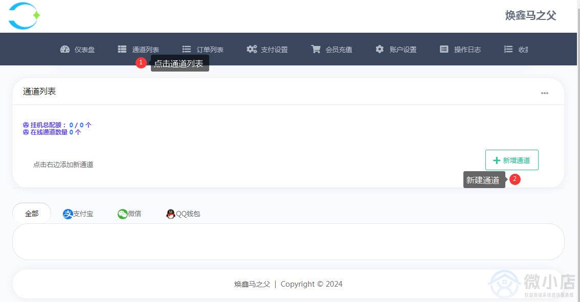 ##### 7.打开微小店后台,找到支付通道设置页面,选择要配置的通道,并选择码支付接口。输入上一步保存的接口信息。