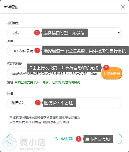 ##### 3.选择通道,并上传收款码,等待二维码自动解析完成后,点击确定添加。