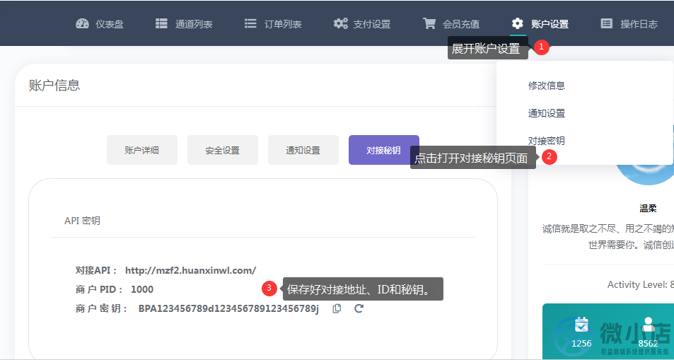 ##### 6.确定接口没有问题后,展开账户设置,点击进入对接秘钥页面,并保存好对接地址、ID和秘钥。