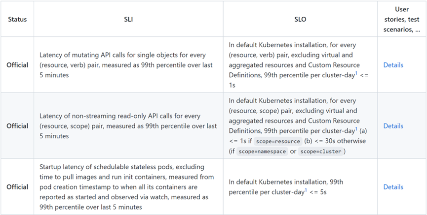 前两个都是API调用延时(详情可参考[api_call_latency](https://github.com/kubernetes/community/blob/master/sig-scalability/slos/api_call_latency.md),第三个是Pod启动延时(详情可参考[pod_startup_latency](https://github.com/kubernetes/community/blob/master/sig-scalability/slos/pod_startup_latency.md))。上面的SLI是Service Level Indicator的缩写,翻译过来是“服务等级指标”(有些也译为“服务水平指标”),即对该指标的描述;SLO是Service Level Objective,翻译过来是“服务等级目标”(有些也译为“服务水平目标”),即该SLI怎么样才算达到。