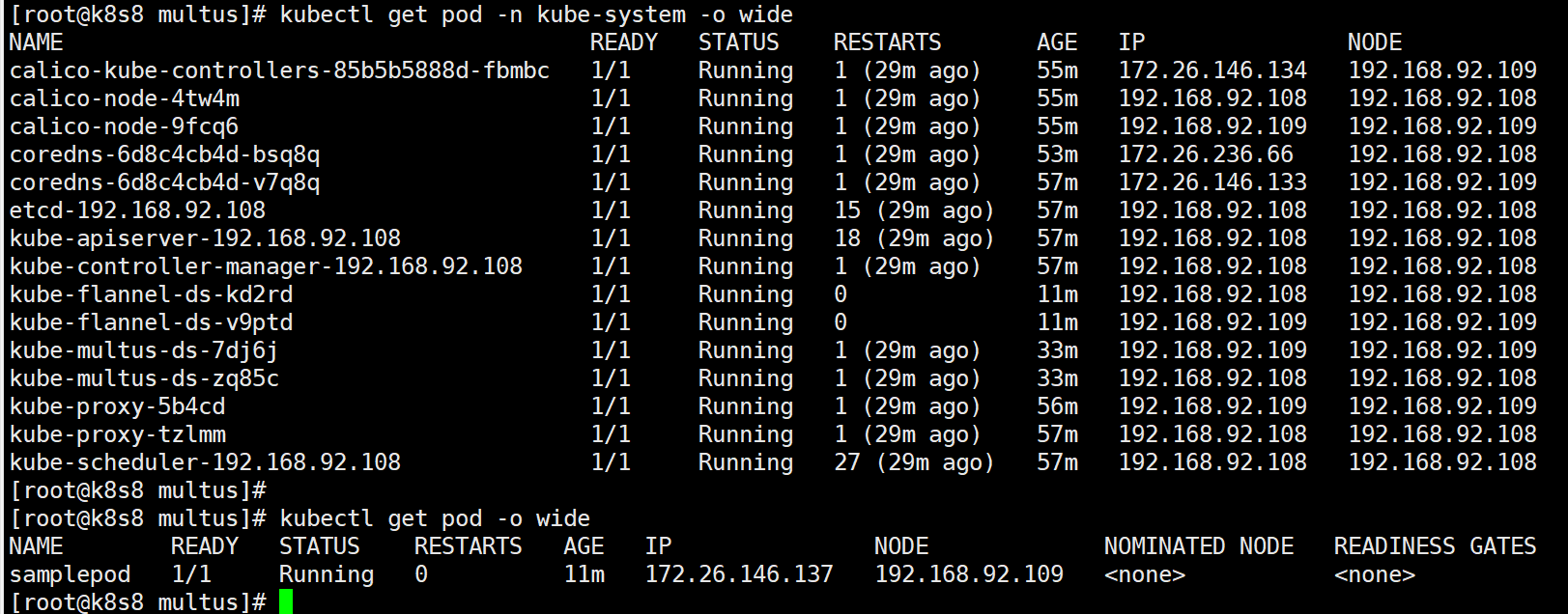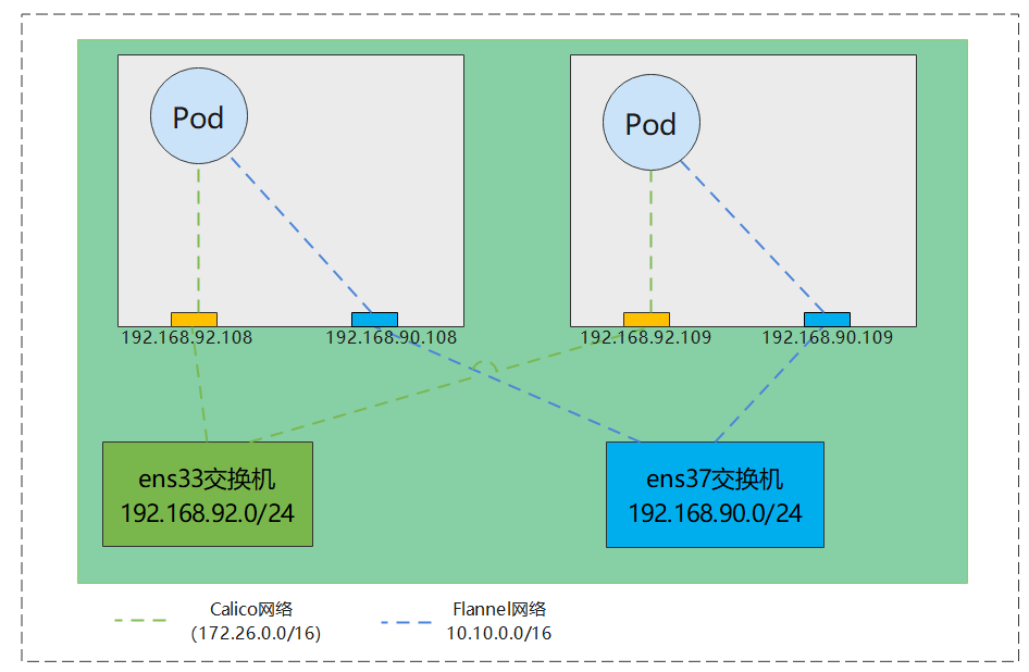 calico网络作为master plugin,走ens33网卡;flannel网络作为attachment网络,走ens37网卡,如下: