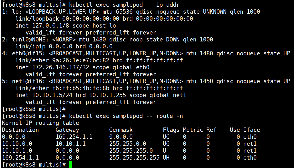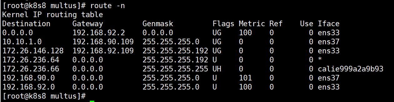 "isDefaultGateway": false # 注意这里要设为false,否则flannel会在容器里面添加默认路由,走flannel生成的net1网卡;因为calico使用了默认网卡ens33,所以容器里面的默认路由也要走calico生成的容器网卡