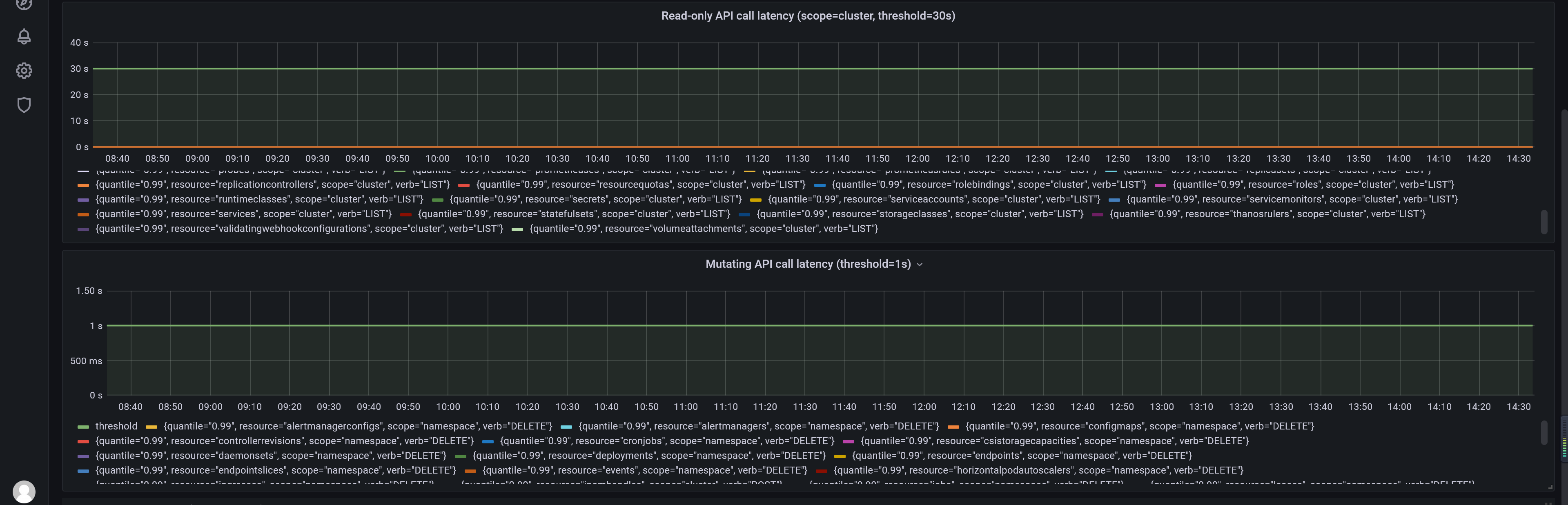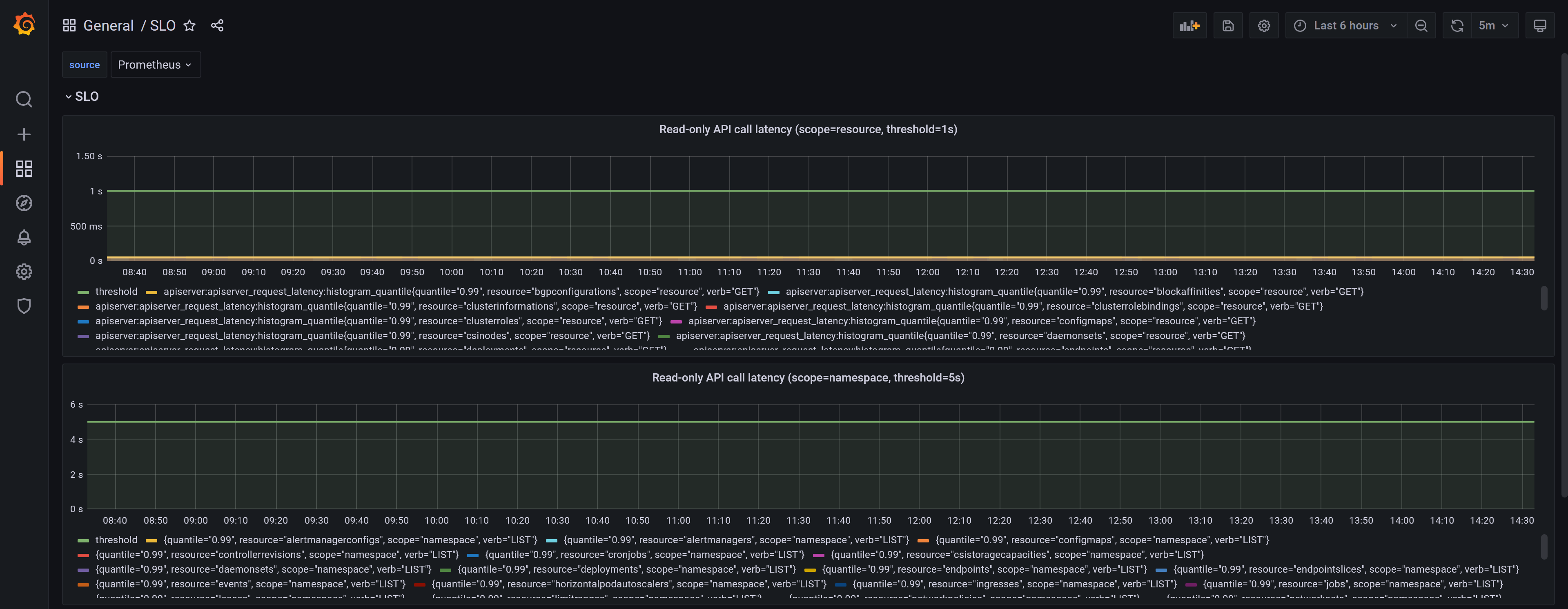 首先,我们看一下这些图表的promql语句,以第一个 Read-only API call latency(scope=resource, threshold=1s)为例,它的查询语句如下: