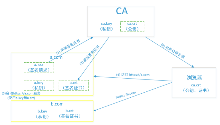 首先,公司A生成自已的私钥a.key和证书签名请求文件a.csr;然后公司A提交自已的csr给CA,CA利用自已的私钥与公钥给公司A的csr文件进行数字签名,生成签名后的证书文件a.crt,然后发给公司A。最后,公司A利用a.key与a.crt就可以提供https服务。外界只需要使用CA公布出来的公钥ca.crt就能访问https://a.com服务。