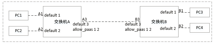 比PC1向PC3发送数据帧,当数据帧到达A1时,A1端口为数据帧添加VLAN-ID 1,然后交给交换机进行转发;交换机查找转发表,如果没有找到转发条目,则将数据帧发给A2 A3端口;A3端口在发送前,发现这个数据帧的VLAN-ID和自己的默认VLAN不一样但在自己的allow-paas中,于是原封不动地发送出去;B3接收到后,发现数据帧在自己的allow-paas中,于是交给交换机B转发;交换机B检查转发表,如果没有匹配上转发条目则发给端口B1 B2;B1发送前,发现数据帧的VLAN-ID为1,与自己的默认VLAN一致,于是去掉数据帧的VLAN信息后,再发送出去。