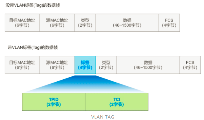 VLAN 技术通过给数据帧插入**VLAN 标签**(又叫`VLAN TAG`)的方式,让交换机能够分辨出各个数据帧所属的 VLAN 。