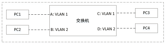 比如说,如下一台交换机连了四台PC,我们把交换机的四个端口都设置为Access端口,A、C端口的默认VLAN设置为1,B、D端口的默认VLAN设置为2。接下来,我们看一下数据帧的转发流程。