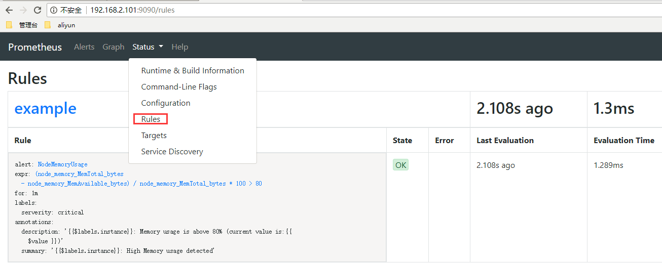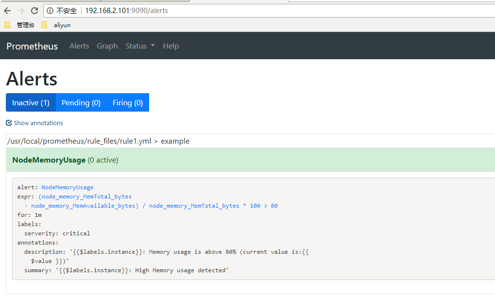 用户还可以通过Prometheus的UI查看告警状态(在`Alerts`菜单下)
