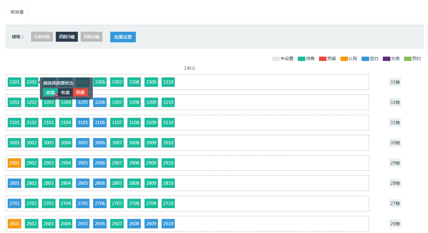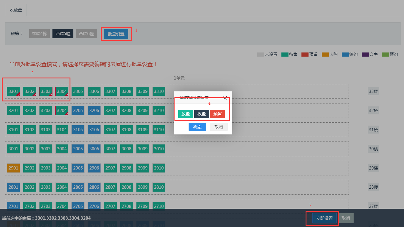 注:如已经认购成功或发起认购的房间无法进行收盘,需要退房或者撤销认购后才能收盘。(放盘前提条件,需要设置房间面积信息及房间价格信息)