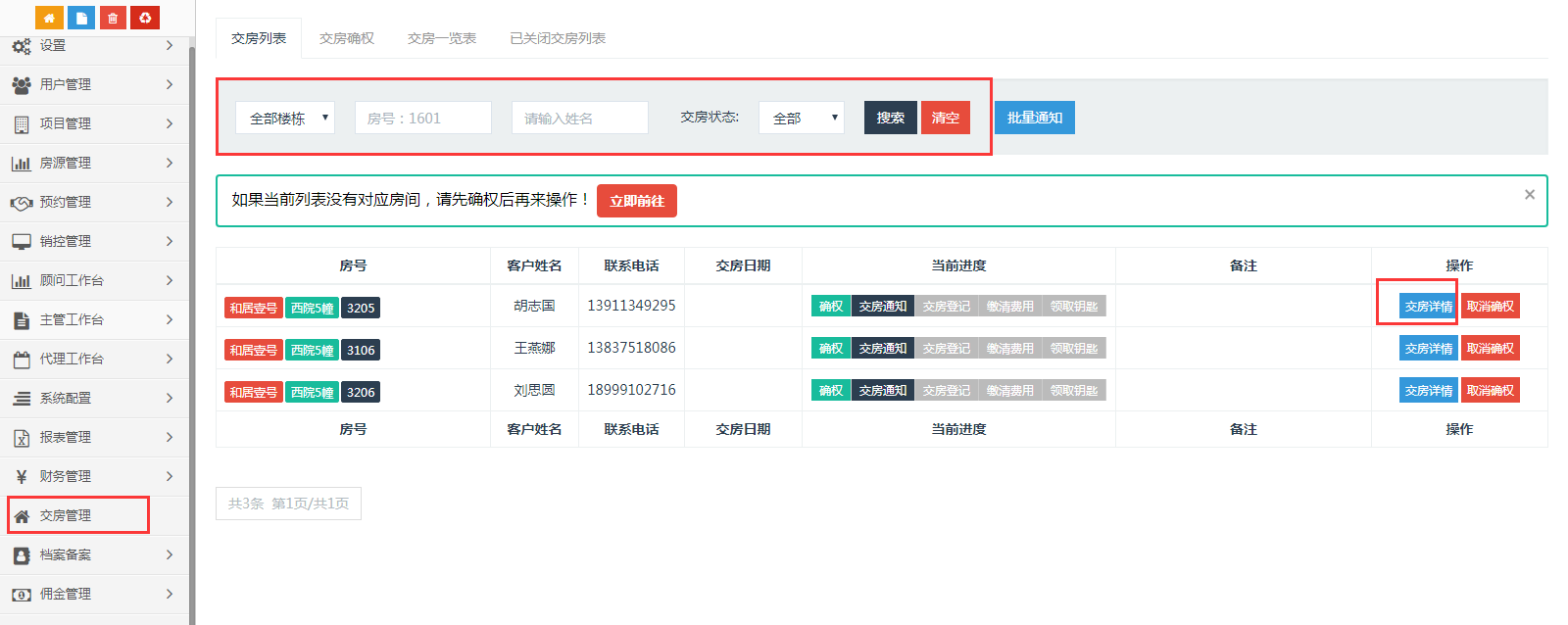 输入需要查看的交房信息的房间号或业主姓名筛选出房间。