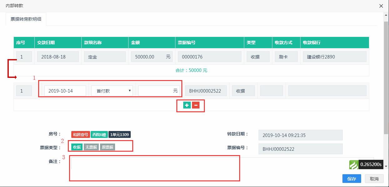 3.将选择转款的收据,转成需要的款项名称金额及对应的款项结构