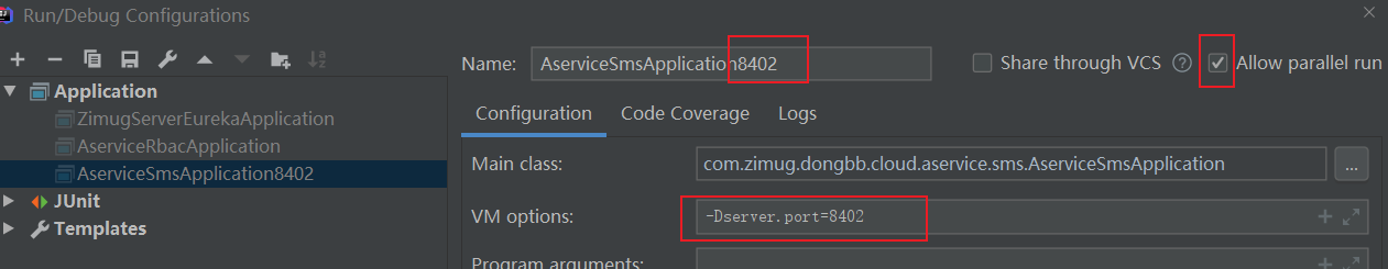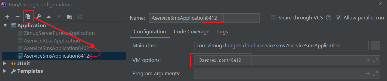 在congbb-cloud的应用中,目前aservice-sms是一个服务提供者,所以我们为它创建多个启动实例。如图:选择Edit Configurations