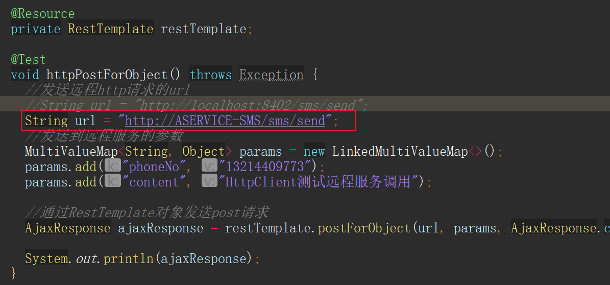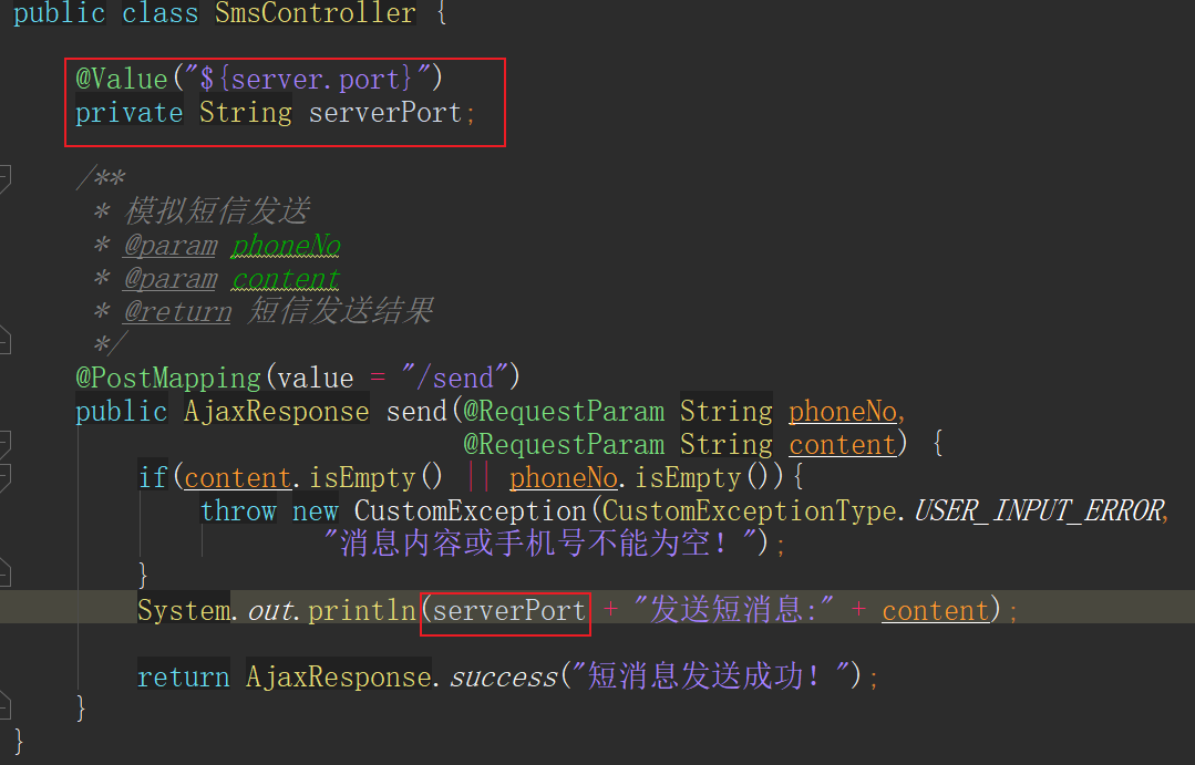 为了使测试结果的显示更加直观,我们为“/sms/send”服务的控制台打印加上serverPort,从而能更清楚的看到响应结果。
