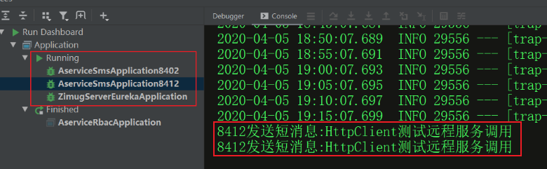 我们同样去执行《RestTemplate多实例负载均衡》章节中的测试用例httpPostForObject。可以看到aservice-sms两个微服务实例的控制台的输出信息。