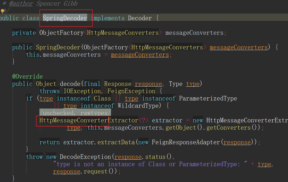 需要注意的是在Encoder/ Decoder 实现实现类中,有一类叫做SpringDecoder和SpringEncoder。来看一下它的代码,从代码中我们已经可以明确的看到支持使用HttpMessageConverter进行请求响应内容的格式处理转换。