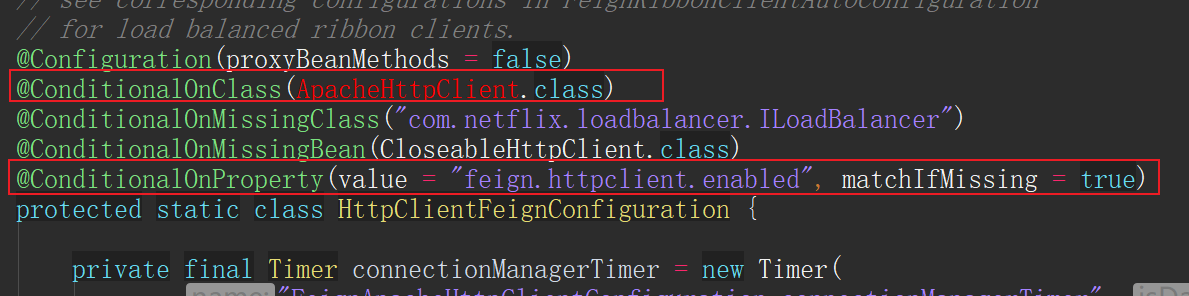 * 需要在配置文件中配置`feign.httpclient.enabled`为true,从@ConditionalOnProperty注解可知,这个配置可以不写,因为在默认情况下就为true。