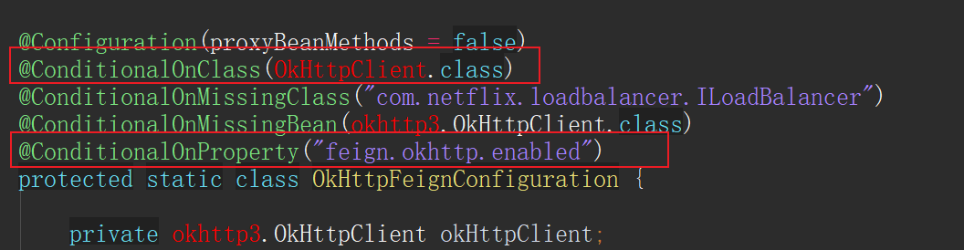 * 从@ConditionalOnProperty注解可知,需要在配置文件中配置`feign.okhttp.enabled`为true。