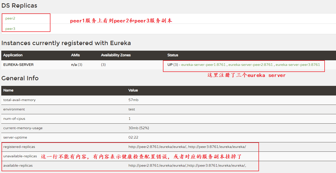 * 访问[http://192.168.161.4:8761/eureka/](http://192.168.161.3:8761/eureka/),即:访问peer2的eureka服务。可以见到DS Replicas中已经注册了peer1、peer3。