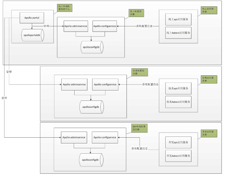 * 一个apollo portal(含ApolloPortalDB)可以管理多套环境,如:生产、仿真(演示)、开发环境