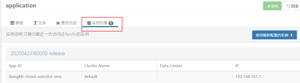 2. apollo的项目视图中,“实例列表”显示我们启动的实例,已经正确的将配置信息获取到
