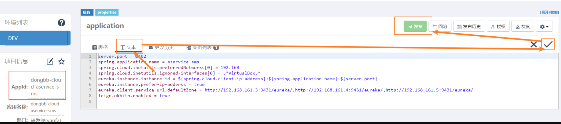 然后copy左侧properties配置信息,到apollo配置中心“发布”配置。(发布到DEV环境的dongbb-cloud-aservice-sms项目,注意下图中左侧红色部分)
