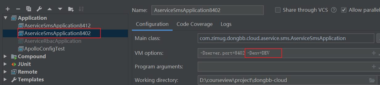 apollo的配置发布之后,我们就可以启动应用了,在启动之前我们需要去配置启动参数:`-Denv=DEV`,也就是告诉springboot应用去加载DEV环境的配置信息。