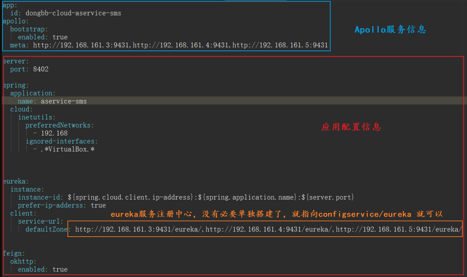 * 第二块:spring boot项目配置信息(图中红色部分)。需要注意的是我们项目使用eureka,就没有必要单独搭建了。因为apollo的configservice中默认包含了eureka。就指向这个地址就可以了。(图中橘色部分)