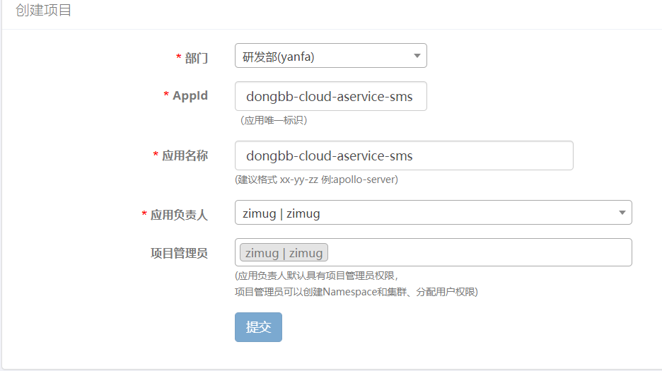 首先我们去apollo配置中心新增一个项目:dongbb-cloud-aservice-sms,对应我们dongbb项目的aservice-sms子服务模块。