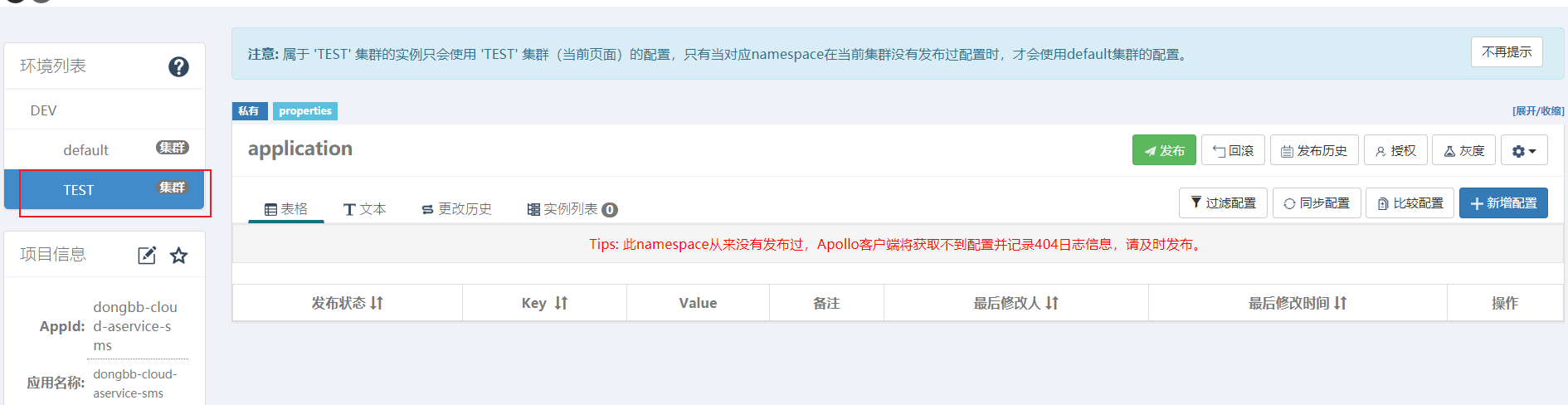 上图显示:项目dongbb-cloud-aservice-sms在DEV环境下,TEST集群暂时没有任何配置项。(因为集群是新建的)。我们之前配置的配置项信息,都属于default集群。