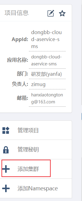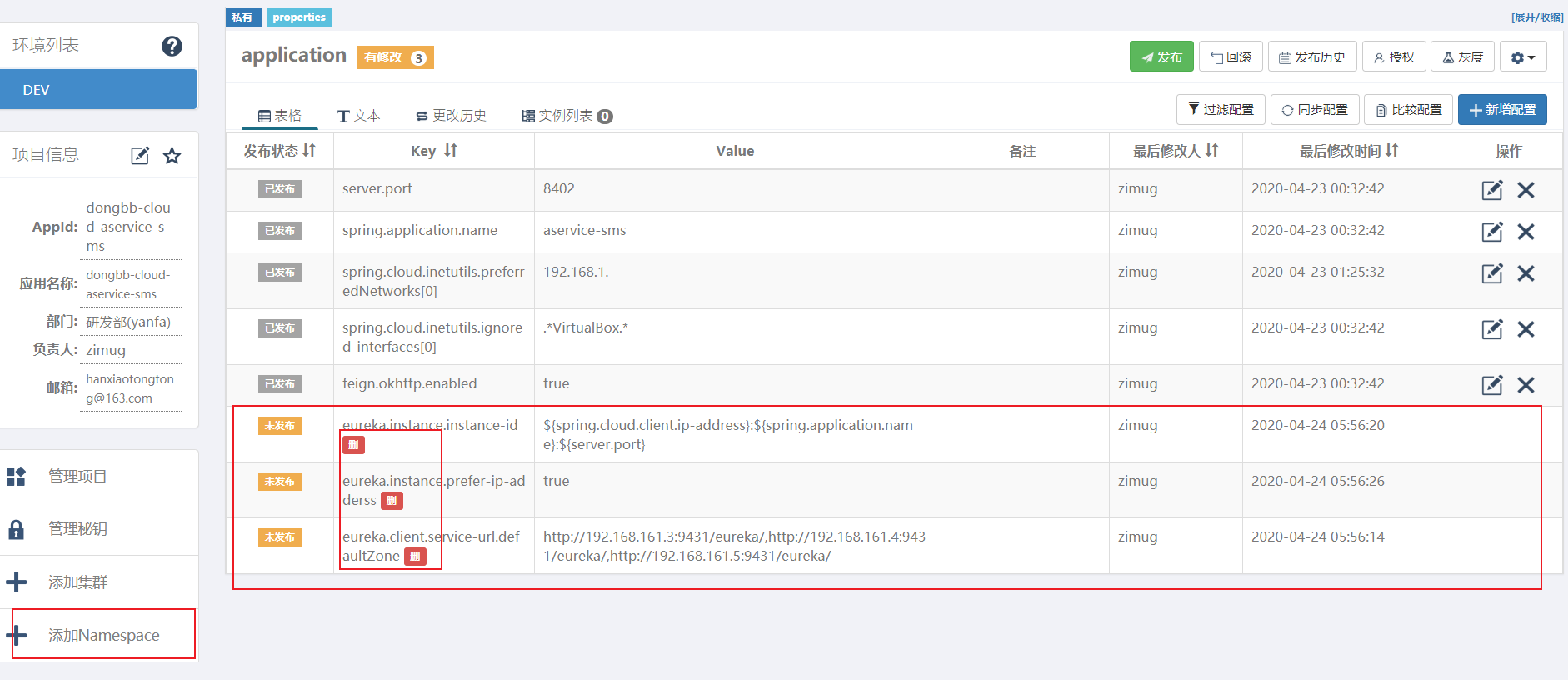 在dongbb-cloud-aservice-rbac项目中我们创建了namespace:yanfa.eureka-client,并使用其配置项。如果dongbb-cloud-aservice-sms项目也想使用namespace:yanfa.eureka-client该怎么办?关联就可以了,不需要新建namespace。