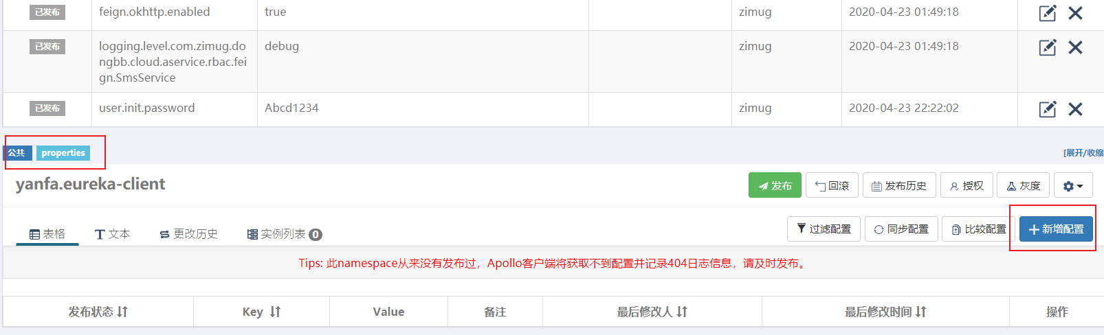 * public 共有的namespace,可以被所有的apollo客户端应用或服务关联使用。