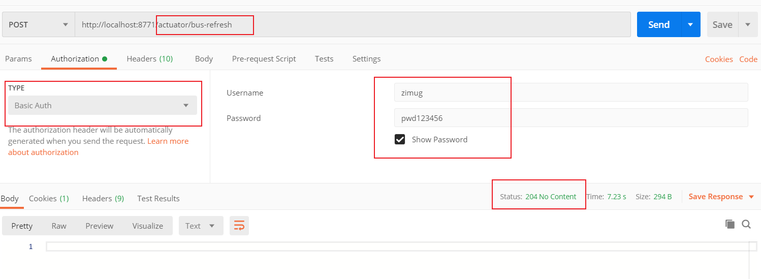 PostMan访问:“[http://localhost:8771/actuator/bus-refresh”](http://localhost:8771/actuator/bus-refresh%E2%80%9D),响应结果为204(虽然暂时我们没有RabbitMQ的消息接收端,但是不影响请求测试)
